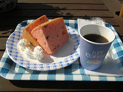 一周ぐるっとまわって帰ろうと思ったけど、お茶飲んで帰ろ~ということで、バラのシフォンケーキを食べました。一人だったのでレストランじゃなくてオープンカフェで。
