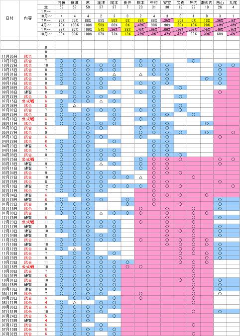 当日に参加するか怪しいので、議題案件を記載しておきます。日時:11/5(日)16:00~場所:播磨町秋が池【案件】・人員整理 会費未納者を対象とし、参加率に応じて整理を行う。 対象:坪内・瀬の内・長井 入会可否の確認:丸尾 ※武貞は連絡が入っており、試験休暇となっている(12月まで) ビジター会員からは参加費を徴収することにする(現在\500と設定しているが\300くらいがいいかも(無料はあまり好ましくない))・男子部ユニ購入 絶対枚数が不足している。 旧部員より集めても、7枚くらいしかない。 購入は上のみとし、極力安価にする。 選定は西山くんに実施してもらう どうしても不満がある場合は、チームロゴ入りのビブを購入する手があるが・・・。 ユニ有り:内藤・原・藤澤・渡津・岡本 ユニ無し:中村(夫)・安室・桝本・西山・武貞 人員整理対象:長井・瀬ノ内・坪内・丸尾 助っ人:森口・ビブ購入 男子部・女子部用にユニと同色のビブが欲しい。 そうすれば、練習試合でユニが着れる様になる。 部費に余裕があれば、男子部ユニ購入に便乗して購入を検討しては?・忘年会or新年会 未成年も考慮して"焼肉"とするか? 開催はいつにするか?希望は?忘年会?新年会?・会計報告 渡さんの一人舞台・各自持ち寄りネタ男子部参加状況・斜線部及び赤色部は対象外 (怪我や旧B_teamや助っ人扱い)・黄色は参加率が悪い(60%以下)