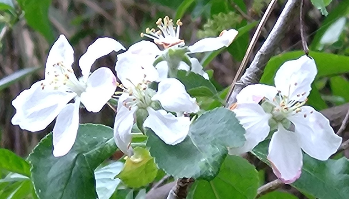 りんご 'つがる'の花花びらのふちがほんのりピンクでとても可愛いです昔、果樹栽培にハマってたころの生き残りです鉢栽培では難しいのを実感しました授粉樹のアルプス乙女は枯れてしまったので結実は無理でしょうねー