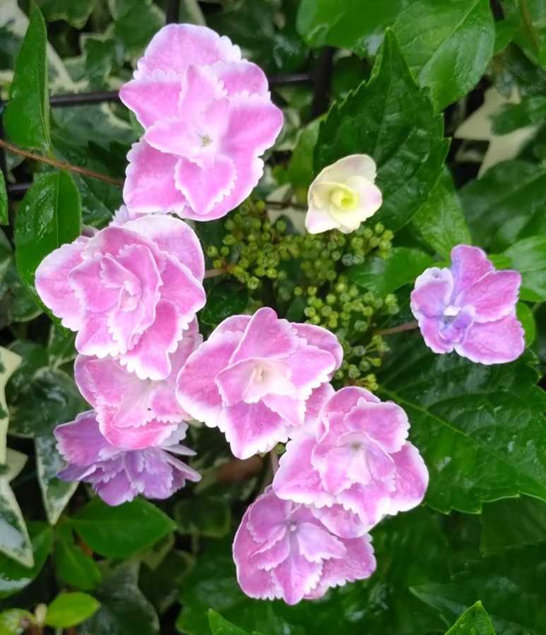 アジサイ 'イズミチオリ(衣純千織)'2021年に購入ここ2〜3年調子を崩して花が咲いてなかったので咲いてくれて嬉しい色が薄いのはまだ本調子ではないからか?