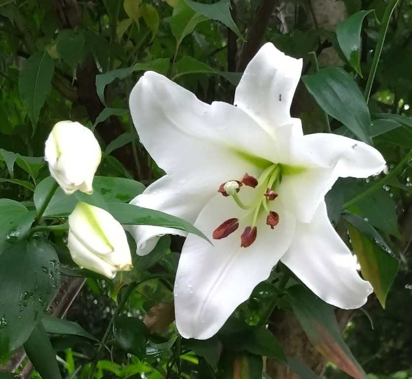 ユリ 'フォーエバー'昨年、品種=カサブランカと思って購入品種名がカサブランカでなくて軽くショックを受けて愚痴ってましたが、早咲きと謳ってるだけあって他のユリがまだまだ咲きそうにないときに大きな白い花は目立ちます気にいったかも