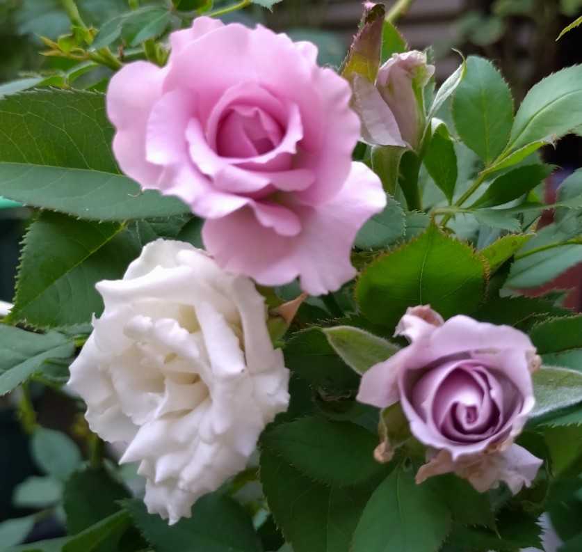 バラ 'シャレード'昨年購入したシャレード咲き進むと色が変わるというよりどのタイミングで切り花にしたかで色が変わります下は一分開きで右のは三分開き上は全開で切った花です同じような咲き進み状態ですが花色がかなり違います温度なのか紫外線なのかその両方なのかはよく分かりませんが結構色が違うのが面白い外で咲いてるとくすみピンクって感じです
