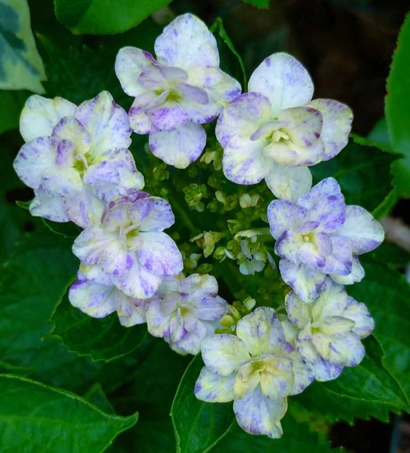 アジサイ 'きらきら星'2014年に購入八重咲きの白覆輪のアジサイはいろいろありますが、がく片の縁の切れ込みが可愛い特徴になってます♪