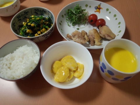 昨夜の晩ごはん鶏もも肉のソテー、ニョッキのカルボナーラ、ほうれん草とコーンの炒め物、かぼちゃのポタージュですニョッキはじゃがいもが安かったので(38円/個♪)自作材料じゃがいも・・・400gくらい卵・・・1個チーズ・・・大さじ1(本当はパルメザンなんですがピザ用で)強力粉・・・80g作り方1.じゃがいもは串がすっと通るくらいまでゆで、熱いうちに皮をむき、つぶす2.少しさめたら卵、チーズ、強力粉を加えて、練らないように混ぜる3.一口大に丸め、フォークのあとをつけて、浮いてくるまでゆでる(塩は適当)面倒なので市販のソースをからめてます1歳児だと、チーズの風味があるので味付けなしでもいいかも娘はゆであがりをモリモリ食べてました