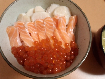前記事のいくらの醤油漬と、トロサーモンを乗せて鮭の親子丼です娘にはニョッキ、帆立とほうれん草のミルクソース和え、ミニトマト、鶏とたまねぎ、人参のカレーを出したので、余った帆立も一緒にのっていますいくらは今晩も食べる予定(^^♪楽しみです