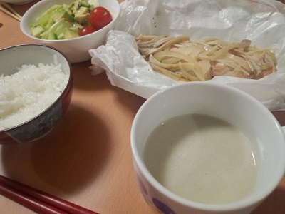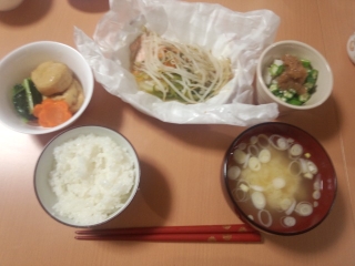 今日の晩ごはん鮭の奉書包み焼き風がんもどきと梅人参、小松菜のあんかけオクラと長芋の梅肉和え豆腐と長ネギのお味噌汁和って感じです。