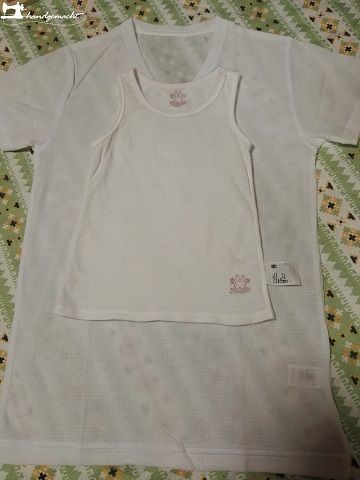 首回り、袖ぐりをニットテープでくるんで、肌あたりを良くしたら出来上がり