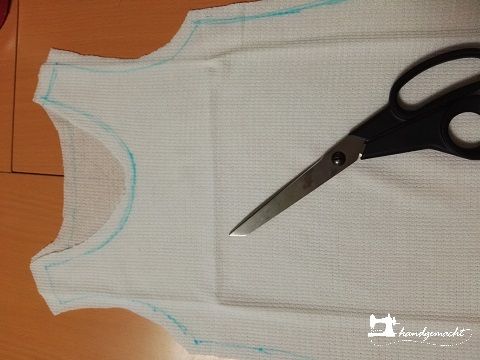 適当に作るので型紙はなく、ユニクロのタンクトップをのせて直接ペンでしるしつけをします