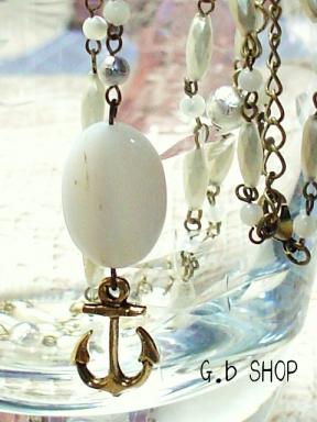 新しいアクセサリー、第2弾です***昨日のネックレスとおそろいのブレスレットです*** 淡水パールのフラワーモチーフ・ブレスレット***3連のブレスレットですが、淡水パールの2連と、 スワロフスキーのブレスレットが、別々に付けられます******始めは、3連で作ったのですが、せっかくだから 色々と楽しめた方がいいかな、と、直しました******そして、もう一つ*** ターコイズとアマゾナイトのマリン・ロングネックレス***これは、これから夏休みに付けたい、ネックレスです******マリンといっても、アンティーク調のいかりと、 ターコイズの間のアマゾナイトが、ちょっぴり、大人っぽい感じに******ジーンズに真っ白なTシャツはもちろん、 大人っぽいブラウスにも合うのでは?*** ***ターコイズは、持ち主を災いや危険から守ってくれます アマゾナイトは、進むべき方向を教えてくれる石と言われています******これと同じデザインで、アンティークビーズバージョンも考えています******よろしければ、見にきてくださいね******手作りの小さなお店*G.b shopOPENしています*** アクセサリー、こんなところに置きたいな