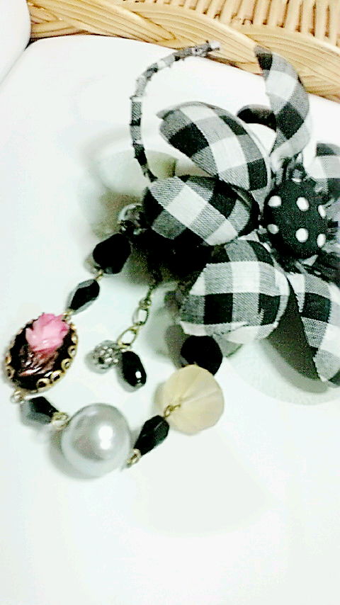 可愛らしいイメージのしまうま50さんに合わせてマーガレット♪黒に栄えるチェックで作り、ブレスレットになるビーズもつけました