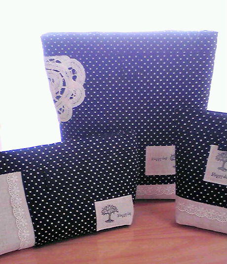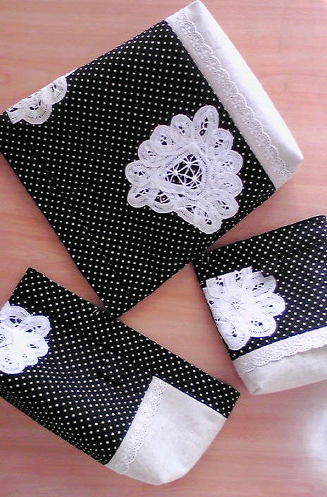 黒のドットにレースとタグを付けて、前回作ったのより大人っぽくなりました***前と同じく大中小と作りました♪***内側はコットンのチェックです