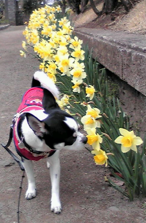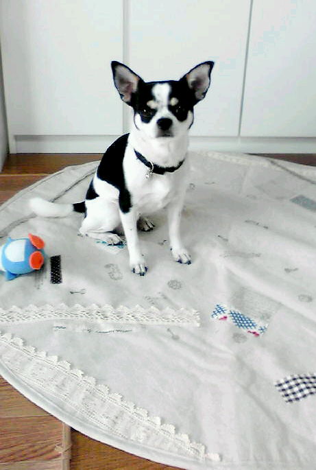 今日は久しぶりにメルの元気な姿を♪***メルのご機嫌ドアップ写真、ダンナサマとお花見、お花に鼻をつけてクンクン♪***そしてずいぶん前に特大バッグを作るために丸くカットしたけど上手く出来なかったものをマットに変えて敷いた上に座るメルの写真です♪