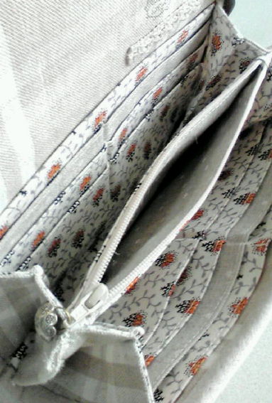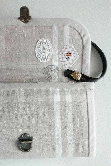 リネンの大柄チェックと合わせて、中にレースモチーフとスタンプなどを飾って♪***ボタンホールがついた皮の持ち手を葉っぱのボタンでとめて♪***ちょっと変わった留め金で仕上げてみました♪