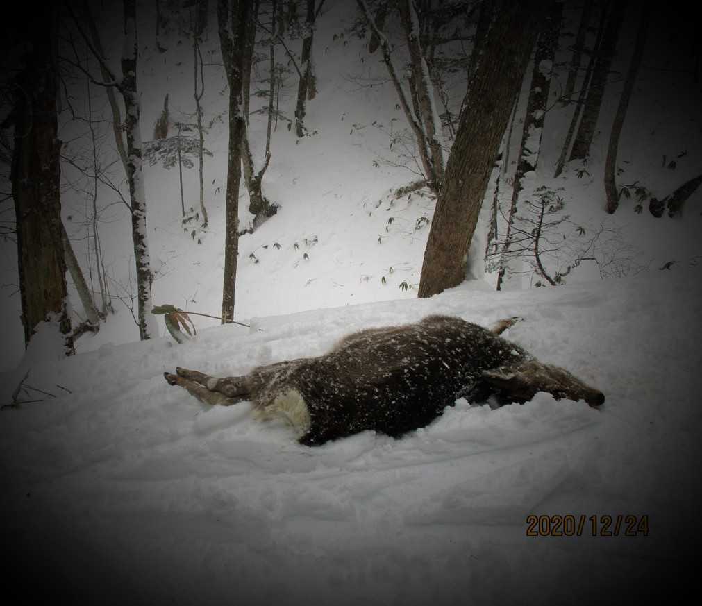 本格的な冬将軍がやってきて、やっとスノーモービルの出番となった。よって、今日はスノーモービルの初乗りで、果たして今シーズンも乗りこなせるのかを試すため出猟した。2~3日前からの積雪は山の林道では、スノーモービルから降りると膝上まで(約60cm)抜かる。ここの所の「しばれ(凍る)」で雪が締まっていなくて、林道のチョットした窪みにも傾き、持って行かれる危うさがあり、立乗りでバランスを取るのに緊張しながらの走行である。林道の窪みなどを見ながらの走行中に、ハット気付けば目の前にシカ残念ながら、なすすべもなく走り去られるこんなことの繰り返しだった今日の初乗りで今シーズンもなんとか乗りこなせる自信が付いた