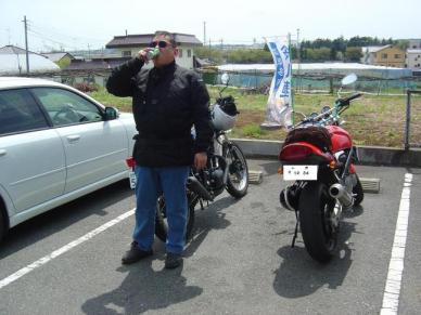 初めて親子ツーリングに行って来ました10時過ぎに家を出て、ガソリン給油。県道24号線を西へ。国道463号線に入るまでちょっと渋滞。国道463号から国道299号までは順調でした。国道299号線は飯能近くまでは快適な2車線。山道に入る前に、コンビニで小休止。これから、山道へ入ることやセメントを運ぶトラックが多くなり、対向車に注意するよう話し、出発。彼岸花の季節になると有名(さいたまだけ)な「巾着田」付近に近づくと、なぜか渋滞。すぐ前に、ビッグスクーターを操るおじさん(私もおじさんだが)が渋滞をすり抜けようと道をそれた瞬間、こけたすぐに立ち上がったので、大丈夫ですか?と声をかけたところ、大丈夫ですと返事が帰ってきた。と同時に、車が動き出した。20m位進んでまた止まる。後ろを見るとまだバイクを起こせないでいる。息子が「起こせないみたい。行く?」と言う。よし、行くかと渋滞の列を抜けて逆戻り。息子とおじさんのビッグスクーターを引き起こし完了。「どうもありがとう!」「気をつけてくださいね」と言葉を交わし、再び渋滞の列へ。息子の一言「ったく、引き起こせないバイクに乗るなよ」ま、いいじゃない。怪我してなかったから。ちょっとしたアクシデントと渋滞を抜け、快調に正丸峠へ。正丸峠から東京方面の眺め正丸峠出発赤いバイクに乗っているのが息子です。正丸峠を発つとひたすら下り。20分程で、道の駅芦ヶ久保に到着。駐車場は満車。空き待ち渋滞でしたが、その点バイクはいいですねすんなり、専用駐車場に。道の駅の食堂でざるそばを頂きました。腹ごしらえをし、次の行程、林道に入りアップダウンの繰り返し。道も狭くなり対向車、登山者に注意すること等説明し、刈場坂峠へ向け出発。途中、武甲山が見えました。武甲山40分程で刈場坂峠到着。刈場坂峠から比企郡小川町方面の眺め刈場坂峠で休息気取りやさん峠の売店でお茶を買い、休息。小さいペットボトルなのに、160円ま、しかたがない。輸送料かな?刈場坂峠を発ち、尾根道を走ること20分顔振峠に到着。顔振峠から吾野方面の眺め893じゃありません。顔振峠にある観光案内に「黒山三滝」の案内がありました。息子が行ってみたいと言うので、予定変更。30分ほど下り坂を走り、黒山三滝入り口へ。なんと、入り口には、ここから先は車両進入禁止の看板。横には有料駐車場。1台500円。息子「ったく、有料じゃん。どうする?」私「バイクも一台500円かな。ま、いいじゃん。折角来たんだから。」と話していると、管理している売店のおばちゃん登場!なにやら、手招きをしている。おばちゃんのところへ行くと、なんと「こっちの道端に止めれば、お金要らないよ」おばちゃん、ありがとう♪(誓って脅してはおりません)バイクを路肩に止め、滝の方へ。結構急な上り坂。日ごろの不摂生が祟りました。10分程上り一つ目の「天狗の滝」撮影したのですが、逆光のため失敗。天狗の滝から5分程上り、男滝、女滝へ到着。赤い欄干の向こうが女滝、右上が男滝女滝女滝から男滝へ行く途中に面白い看板が。本当かな?男滝滝を見て涼んだのち、登って来た道をバイク置き場まで。さすがに、二人とも疲れてきました。最終目的地鎌北湖まであと少し。速度は出さず、慎重に運転するようお互い確認して出発。30分程で鎌北湖到着。鎌北湖湖畔の売店で小休止。コーヒーを飲み湖を眺めて目の疲れを癒しました。鎌北湖は農業用水用の人造湖。へらぶなを放流しており、太公望が釣り糸を垂れておりました。(太公望は写ってなかった(汗))鎌北湖をあとに、県道30号線、国道299号線、国道463号線、県道24号線を通り、無事帰宅しました。走行距離139キロ。7時間のツーリングでした。息子のバイクの排気音を後ろに聴きながら、息子の成長を感じた一日でした。息子は、楽しかった。また行こうと言ってくれました。一日付き合ってくれてありがとう最後までご覧くださいまして、ありがとうございました