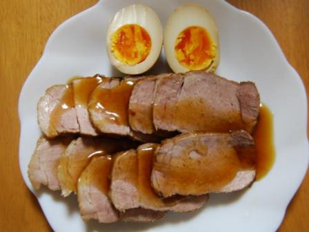 昨日作った焼き豚が完成しました。一緒に漬けた卵も丁度よい感じ。焼き豚と味玉これに、長ネギの細切りに豆板醤を混ぜて付け合せにしたかったのですが、長ネギがなくて…美味しくいただきました♪