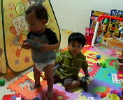 9月27日のこと。 ゆうま君と遊んだ。ゆうま君は2歳ではやとよりちょっとお兄さん。 どういうお友達かというと、リトミック教室でいっしょで、同じマンション、同じ階。 ゆうまママとはなんとなく気が合うような気がしてたんだ。 でもリトミック教室の時はそんなにゆっくり話す機会がなかったから、今回ゆっくり お話することが出来た。 そしたらやっぱり気があった。 同じ名前で、同じくF1が大好きなんだって。私も大好き。 ゆうまママはスペインのサーキットにも行ったことがあるんだって。 かなりすきなんだねー。でもそれぐらい好きな人が近くにいるなんて なんだかうれしいな。 ゆうま君と隼人は周波数があうようで、仲良く遊んでいた。 遊んでもらったというほうが正しいね!! またF1の鈴鹿GPが終わったらあそんでもらおう。