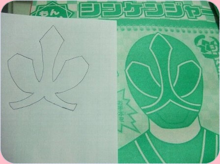 はやりんの幼稚園は週1回、お弁当。なるべくかわいく作ってあげて食べる意欲をださせたいもの。はやりんはたべないほうではないけどね。そこで今回はシンケンジャー風弁当。まずはテレビマガジンから型紙を作る。画用紙を切って海苔とあわせて切るだけ『ママー、どうやってつくったの?』なんて聞かれて嬉しかったわ。。。やっぱりなんでも喜ばせてあげたいよね。+まりもん+