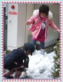 本日、雪ということで、雪だるまをつくりたい。。。というはやりんの意見のもと、家を出る時間を早め、朝、8時半に出発幼稚園から帰る頃にはもう雪はとけちゃっているだろう早めにでた。。同じ考えのママさんが他にもいたわ。雪なんてめったにみないから嬉しかったみたい とにかく二人はたべる。。。お菓子も食べるし、ご飯もよく食べてくれる。。 お菓子もつきた。。。でもまだご飯はできない。。。というのでしょうがなく 最初、あじのり。。。それもなくなったので次に普通ののりをあげたらそれも 二人で食べていた。。。 味のりはこの間、1日で1缶食べていた。直径10センチぐらいの缶のもの。 おかしばかりもなにかなーーと思ってのりにかえても結局たべるみたい。。 本日はイチゴのゼリー。。大きいのを見るとすごーく子供たちが喜ぶ私の母は必ずデザートを2種類ぐらい出してくれるタイプで、果物は高くてもいいの、おいしいから買っちゃうわ。。のタイプ。私はそれがすごく嬉しかったのだけど、アイスとかゼリーっていつも兄弟半分ずつだったりするでしょ。だからいつか家でつくったゼリーをボールにつくって好きなだけたべたいな。。って小さい頃からずーと思ってた。でもいざ作るとそうたくさんは食べれなかったけど。。。だからはやりんとりーにはご飯食べた後、好きなだけこのゼリーをたべていいよって言ったら、、、はやりんは明日も食べたいからとっておくと言っていた。りーちゃんは言葉ではまだいえないけど食べ続けたいみたいだった。+++designed by