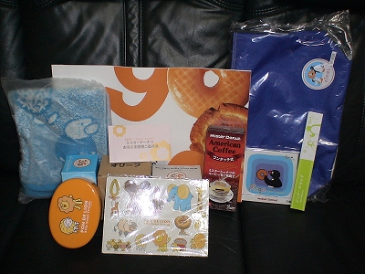 フラッと出かけた先で見つけたミスド。母がドーナツを買うと言うのでじゃー福袋買ってみれば?他の方達のネタバレを拝見していてドーナツの券が入っていることを知っていたので薦めてみた。1000円のを購入中身はこんな感じ・カレンダー・卓上カレンダー・トートバック・扇子・マグカップ 2つ・グラス・コーヒー・お弁当箱・タオル 2枚・マグネットシール・好きなドーナツ10個券・割引券なんかいっぱい入ってたよー!正直あんまりいらない物ばかりだけど(笑)でもいっぱい入ってるとひとつひとつ手にする楽しみがあって嬉しいです。まだ売ってるところあるみたいなので興味のある方はミスドへ行ってみてください☆