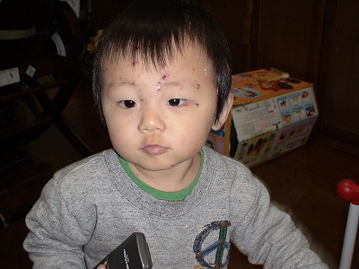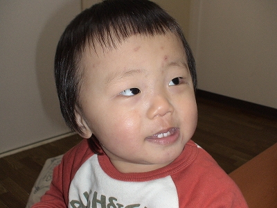 私は4日まで仕事はお休み。パパは4日から仕事だったのでチビ郎と2人きり。午前中は家の中で遊んでいました。待て待て待て~~~と追いかけてあげるとかなり嬉しそう♪でもずっと家の中じゃ飽きちゃうのでお昼寝をたーっぷりした後ボールを持って近所の公園へ遊びに行きました。同じぐらいのチビッ子が居るといいなぁと思ったのだけど居たのは小学生のお兄ちゃん達だけでした。もう少し早い時間に来たら居たのかな?遊ぶ友達は居なかったけど公園でチビ郎は大はしゃぎ。雄叫びをあげながらその辺を走り回っていました。小学生達はサッカーをしていたのでブランコ・滑り台などの遊具は貸切状態。バッチリお砂場着を着させているのでいくら汚してもいいぞ。さぁ、行け!チビ郎!遊具で遊ぶより、走り回っている方が楽しそうだったかも。寒くなってきたのかチビ郎がグズグズ言い始めたので撤収。家に着いてもまだ機嫌が悪そう。ん?どうした?と、思っていたら昼間あんなに寝たはずなのにまた寝ちゃった。これはおかしい。。。オデコを触るとちょっと熱っぽいかも。そして1時間半ぐらい寝て起きてきたチビ郎のオムツを取り替えようと肌着をめくるとポツポツとデキモノが。私は勝手に水イボだと決め付けていたのだけど会社から帰って来たパパに見せると「水疱瘡じゃない?」と。何故か水疱瘡が全く頭に思い浮かばなかった私。パパの言葉で慌ててネットで水疱瘡を調べたらむむむその可能性大。うわ~5日から仕事だけど行けない。。。しょうがない。出社はもうこの時点で諦めました。時間が経つにつれポツポツがみるみるうちに広がりました。お腹、背中、顔。こりゃ間違いないねと確信したのでした。