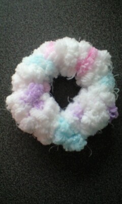 今日は今週2回目の手芸クラブ。私は自分が今編んでる松編みのマーガレットの他にシュシュ用の糸やヘアゴム、手芸クラブのメンバーさんが編んでるポンチョの編み方を教える用の糸を持って行きました。ポンチョはヨーク切り替え部分から襟元に向かって編みあげる所で、前立ての編み方まで教えた所で私はシュシュ職人となりました。100均で買ったポンポン付きの毛糸でこんなシュシュを3つ作ってプレゼントしてきました。 「毛糸だま春号」も届いたので、クラブメンバーのキャロルさんにチラ見せ。(オイ【日本ヴォーグ社】毛糸だま 2011 春号価格:1,365円(税込、送料別)かぎ針編み特集の春号、基礎本付きだし作品もひたすら長編みが多く、モチーフ編みもあるけど初心者向けな感じだったのでおすすめしちゃいました。100cmと120cmの子供サイズがある作品が1つだけ載ってました。今回は大人用もMとLの2サイズ記載されてました。そんなんやって遊んでたのでマーガレットはたいして編み進まず、全体の3/4ぐらいが編めた程度。ちゃっちゃとやっちゃえば今夜にでも出来上がりそうなんだけど・・・手芸クラブの後、昼ご飯食べて児童館に遊びに行ったので子供もよく昼寝してくれてるけど私も疲れて眠いっす・・・なので今日中の完成は難しいかな。今週の土日は旦那ちゃんが仕事みたいなので、子供達とたんまり遊んでがっつり寝かせて編み終わろうと思います。春物の編み物作品見ちゃうと、やっぱり春夏物の毛糸が欲しくなります。気を付けなはれやっ!
