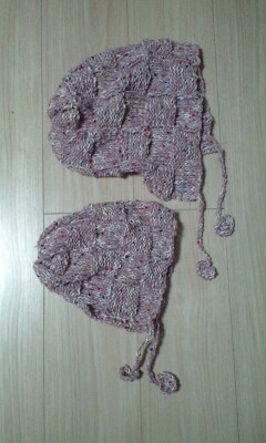 あ~スッキリした。 親子お揃い帽子3部作、出来上がりました。 耳当てから垂れ下がるチンチロリン、happyちゃんがもぎ取った経験から、sunnyちゃんのチンチロリンは短めに一応形だけ付けた感じ。これでももぎ取られるかもだけど。 ちなみに、使用針は12号棒針と10号かぎ針。 私のは72目で60段。9目×10段の格子柄。59段目で2目1度して60段目はそのまま36目を編み、糸を通して引き絞る。 その糸で続けて半分強ぐらいをすくいとじ。 縁編みは輪にして鎖3目立ち上がり、長編み7目、鎖3目で輪に戻り引き抜き編み。引き絞るとハート型になります。 鎖編みを適当な長さになるまでしてから、細編みと鎖編み1目ずつ交互で縁編み。左右の長さがおなじになるよう鎖編みして、もう片方のハート型チンチロリンは別に編んで繋げます。 happyちゃん用は64目×50段で8目×10段の格子柄。 sunnyちゃん用は56目×35段で7目×7段の格子柄。 これでsunnyちゃんのサックコートに落ち着いて取り掛かれる…かな?