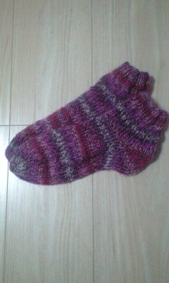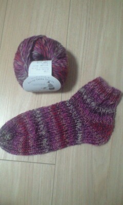 チュニック3部作を完成させてちょっとお疲れ気味なので、軽く小物に逃げてみました。新しい毛糸も試してみたかったし。今編んでるのはショート丈の私の靴下。 使ってるのは毛糸ZAKKAストアーズさんのブリリアントカラーズ創作意欲が沸きだしそうな・・・!ロングピッチの段染めです。シンプルに編むだけで編み込み模様...価格:240円(税込、送料別)6番と9番の色を買い、今回は9番の毛糸を使ってみました。私の好きな紫色がベースになった、ややロングピッチの段染め。甘撚りメランジェな感じ?糸もロービングヤーンっぽいので間違って編んでほどくと糸がモアモアしたり強く引っ張ると切れそうだったり。カウチンヤーンみたいな感覚ですかね。洗濯するとフェルト化しそう、あったかそう。そんな所もカウチンっぽい。編み図は家にある靴下の編み図をいろいろ見て、適当に自作。載せられそうだったら後ほど編み図載せるかもしれません。段染めを生かすには複雑な編み地は向かないのでシンプルにしました。本に載ってる靴下の編み図ってショート丈がなくないですか?私はショート丈の方が好き。なので自作しました。早く作れるしね。