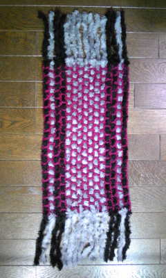 手芸クラブメンバーのキャロルさん、早速先日の毛糸バザーでゲットした糸で敷物を作ってくれました。 ステッチマフラーの応用で作られてますね。ステッチマフラーの編み図は「みんなの、まきもの50」あたりに出てます。【送料無料】みんなの、まきもの50価格:1,365円(税込、送料別)私も早くバッグ仕上げなくちゃ。ハピ子も旦那ちゃんも、アンダリヤ系の糸がとっても不思議らしく、握ったり撫でたりして素材を肌で感じています。ハピ子はアンダリヤ系の糸を触った時の音から「もしゃもしゃの糸」と名付けていて、「ねーママ、今度ハピ子にももしゃもしゃの糸のバッグ作ってぇ」と注文を入れて来ました。あ、余るかなぁ・・・糸。余らなかったら・・・ホームセンターでカラーのビニール紐買ってきて編んでごまかそうっと。こんなやつ。【送料290円 2900円以上で送料無料】【平日即日発送】信越工業/玉巻ひも 300m/#30価格:176円(税込、送料別)