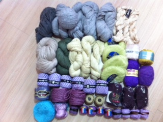先週行った毛糸バザー、最終日の最終時間1時間前に参戦してきました!サニ子をおんぶして、ハピ子はお手伝いにいらしてた優しいお姉さんに遊んでもらって。ゆっくり糸を吟味できました。ハピ子は帰りの電車内で「お姉さんと『バァ!』ってしたね~。ぐる~ってして~って言ったの。オバケいたんだよ~。ニャンニャンもいたよ~。もしゃもしゃの糸(アンダリヤの事)見たね~。お菓子食べたね~。」としゃべりっぱ。相当楽しかったんでしょう。旦那ちゃんの会社に到着したら「電車は?もっと電車乗る~」とぐずり、車に乗って帰宅の途についたとたんに大いびきで爆睡してました。きっとハピ子は「毛糸って楽しい」「ニッターさんって優しい」というイメージを持ったに違いありません。あの時ハピ子とずっと遊んでくれていたお姉さん、本当にありがとうございました。サニ子も最近人見知りで、家族以外の人と目が合うと泣くけど、きよかさんの妹さんや主催者さん達には、会っても泣きませんでした。しばらくしたらおんぶのまま寝ちゃってたし。さてさて、前置きが長いですが、2回目の参戦での戦利品レポ。今回は多すぎて全体図が撮れませんでした。アンダリヤ 上から薄藤、エンジ、茶っぽいオレンジ、ベージュシルバーの糸10玉、きよか先生の妹さんに選んで頂いた薄水色のモヘア。アンダリヤ系の糸シルバー、ロイヤルブルー3玉。アンダリヤのゴールド1玉。濃いオレンジ1玉はカシミア混。右のまとまった量のオレンジはモヘア。 右の4玉はシルバーグレーのモヘア ショッキングピンクのモヘア、その下の黄色っぽいのは黄色、黄緑、オレンジなどのメランジヤーン。ピンクの左はハマナカボニーの紫。 薄オレンジのモヘア、緑青のカセ糸(サラサラしてるので夏糸っぽい)下のオレンジバラ玉はオマケ 左のパステルグリーンは実は濃い緑のポチポチが入ってて可愛い糸なんです。グリーンと紫は触り心地ふわふわ系。エンジのカセも、良く見ると黒とのメランジ。エンジとロイヤルブルーは夏糸系。紫の隣のゴールドはラメ糸。ちょっとしかないので小物の引き揃え程度かな。その隣の白っぽいのはアトリエアルファのベージュ。 発見したときに心の中で「おぉ~」と叫びそうになった麻混の糸。麻、アクリル(カシミロン)、レーヨン。適度にツヤがあるサラサラ糸。こっくりとした深緑とパッキリした色合いのオレンジ。 上の茶3玉と薄ピンク1玉は綿のテープヤーン。下は夏糸系のオレンジ色。似てるけど2,3種類あります。結構サービスしてもらいました。