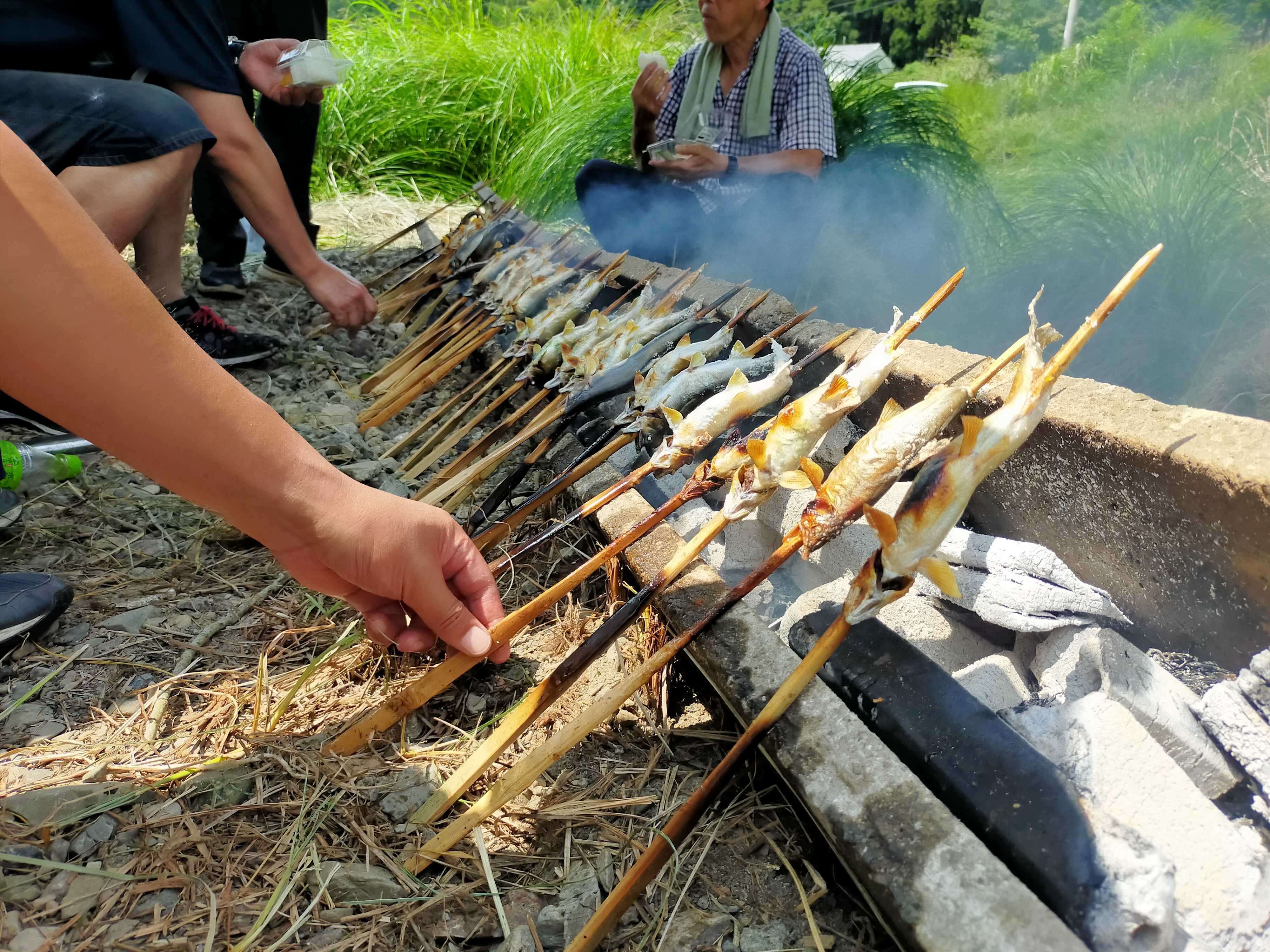 暑い中、つかまえたアユを丁寧に炭で焼いていただいてくださってます