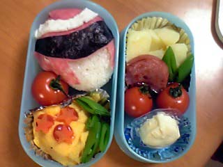 先日、保育園でお別れ遠足がありました。長男に勢いよく、「電王弁当にしてあげる」と豪語しましたが…。………。なにこれ…。息子にも同じ言葉をいわれ、ショックだわ、情けないわで、前のボウケンジャーの方がまだマシでした。おじゃる丸に出てくる星野父の出来損ないみたいになってる…。次男には初めてのお弁当日で、年相応、ベターにアンパンマン弁当でした。こちらはかなりお気に召したようで、写真を見てもうれしそうに自分のだと主張しています。朝これを今食べれないんだと説得するのが大変でした。