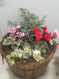 クリスマスに向けて、寄せ植えを作りました。うーん、画像がイマイチ汚い。携帯カメラで撮ったせいか、腕が悪いのか…。コニファーにゴールドクレストを持って来たら高さもあって、もう少しクリスマスっぽいし、ツリーっぽいし、しっくり来たんだと思う。あえてコニファーにゴールドクレストではなくブルーバードを持って来たのは、昔まだ、旦那とお付き合いしている頃にブルーバードをプレゼントしてもらったんだけど、枯らしちゃって…、そのリベンジを込めてのものなのです。今度こそは大きく育てるぞ!入っているものは・コニファー(ブルーバード)・ガーデンシクラメン(ビクトリアミックス)←何気に一番高い・ガーデンシクラメン(レッド)・シルバーレース←見えないけど入っているんです・アイビー(ミントコリブリ)