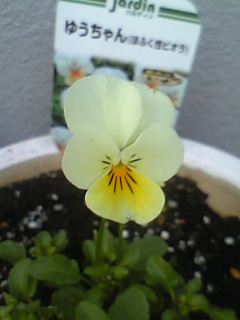 ビオラのゆうちゃんです。なんていうか、うちの子もゆうちゃんなので、嬉しがって買いました。クリーム色なんですが、寒くなると水色っぽくなるらしく、今から楽しみです。子供も自分の名前の花があるのが嬉しいようで、いつも気にかけています。ほかにも、となりのあいちゃん(在庫なし(汗))あいちゃん(在庫なし(汗))みいちゃん(在庫なし)どうも、楽天さんには在庫がないようなので、欲しいなぁと思われる方は、近くの園芸店へ行った方がいいかもしれません。ちなみに私はコーナンでゆうちゃんを発見しました!毎週足を運んだ甲斐がありました。個人的にみいちゃんを探しているのですが、なかなか見つかりません。朝焼けというか、夕焼けというか、この色合いがなんともいえず綺麗なので気に入っているのですが。昨日ちょっと遠い園芸店に出かけたら、ブラックジャックというビオラを発見しました。黒というより、濃い紫ですが匂いがとてもよかったので購入を考えています。