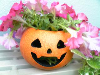 そろそろ春夏の花たちが枯れてきました。今日は朝顔の鉢を片付けました。夏場全然実をつけなかったオクラがラストスパートで3本ほど実っていますが、葉も随分落ちて終わりを感じさせています。夏場枯れていたナスタチウムも新芽をつけていますが、細くてよれよれなのでどうなる事やら…。ペチュニア達だけが元気で、いっぱい花をつけています。ちょっと広がってきたので、思い切って剪定。玄関に置いてあるハロウィンのかぼちゃに挿してみました。いつもは夜になると暗がりの中ぼんやりとひかり、だんなが帰ってくるのを待ち構えているのですが、今日はちょっとおしゃれ?かな?