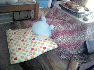 頭痛な朝を迎えました・・・・2日目どうして目覚めが頭痛なんだろう薬も効かないなんて、悔しいったらありゃしない な~んて、ちょっとブルーな気持ちで目覚めた朝だったのにお嬢の部屋を見て、『プッ』こたつでぞうさんが寝てる先日成人式を迎えたお嬢であって。決して園児ではないしかし彼女が園児だったころ。幼稚園にある「ぞうのぬいぐるみ」を自分の洋服に包んでは、持ち歩きだれもが「○○ちゃんのぞうさんがぁ~」なんて言ってたのを思い出した・・・・・・・今夜彼女に聞いてみよう 「ぞうさん」がこたつで寝てたよ と・・・・・・・・