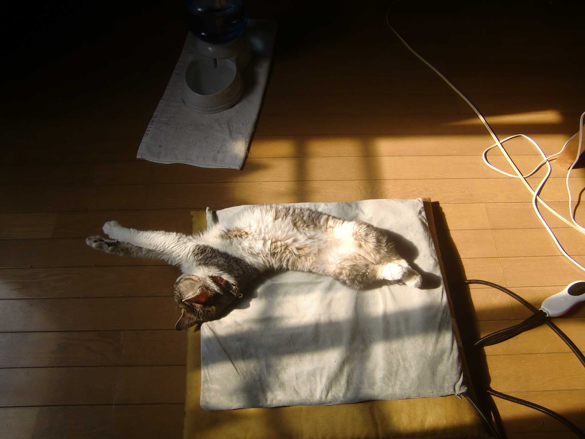 シェイディーは日曜日に動物病院で診てもらって、皮下点滴を打ってもらったらすっと熱は下がりました。抗生物質のようなものは入れないで貰ったのでホントに水分を補正してもらっただけなのですが本人の自然治癒力の後押しをしてくれたのだと思います。ところが夜から下痢が始まりました。食べれていないので胃液も吐きます。まいったまいった。月曜日は動物病院出勤の日なのでシェイディーは家で母に見ていてもらいます。食欲はなく、良く眠り、下痢をして、胃液を吐いているようです。夜仕事から帰って来て処方してもらった皮下点滴セットを使い自分で皮下点滴をして様子をみます。やはり水分が入ると少し食欲が出るようです。日曜日病院から帰った後も少し食べてましたから。火曜日、今日は私が家にいられる日なので、トイレを綺麗に洗ってあげることにしました。少しは気分が良いかな~と。全体の砂を入れ替えてトイレを洗い干しました。すると、少し前にしたはずなのにシェイディーが外のトイレを見ています。「んっ??こりゃ早く取り入れた方が良いかな?」と思っていたら。ふら~とどこかに去っていったので追いかけると台所の隅でうんぴ~をしていました・・・「やっやめて~」急いでトイレを取り込んで砂を取りにいっている間に今度はなにもセットしていないトイレでち~をしていました・・・「食べてないのにたくさんでるね~」この水分もどこからやってくるのやら。ジェラの散歩とセミナー関係の振込み6件もあったので外にもいかなければなりません。シェイディーを寝かしつけ振込みを三つの銀行に分けてすませ、井の頭公園へ。木漏れ日の中ゆっくりお散歩しました。帰ってからはシェイディーをゆっくりマッサージして一緒にお昼ねです。シェイディーは満足そうにゴロゴロいってました。こういう時間が最近とれていなかったから不満だったのかな???まさか不満熱か???(シェイディーにはこれがあるので困ります。精神的なことで下痢したり吐いたり・・・今回の理由も思い当たることはあるにはあるのです。)ゆっくりお昼ねして目が覚めるとシェイディーがご飯の催促!!おっ食欲出てきたの???これなら病院行かなくても大丈夫そうです。あとは下痢が止まってくれればいつものシェイディーに戻ります。いつもの鬼のような食欲が早く戻りますように・・・