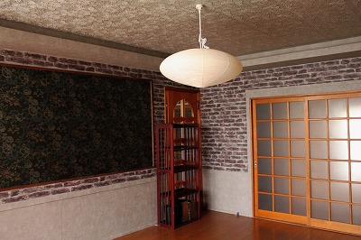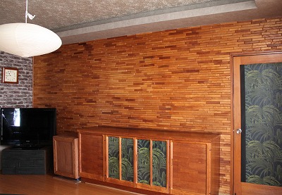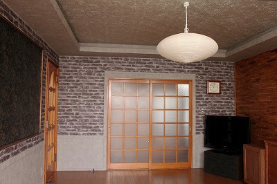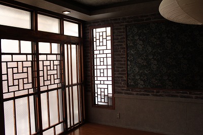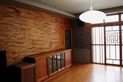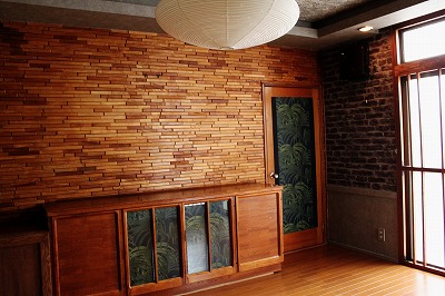 木レンガ壁をそのまま残し、ドアとサイドボードのガラスに