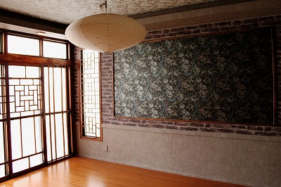 ミスマッチとも思えるような 女性的なアンナフレンチの壁紙を合わせました。