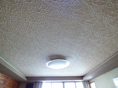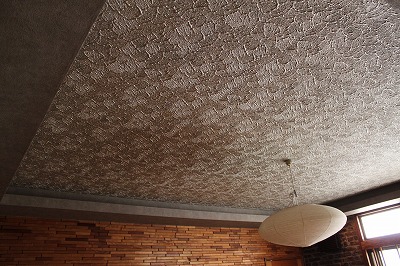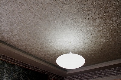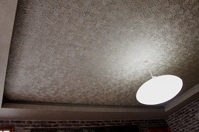 光が反射してコンクリートの壁紙を貼った折り上げ天井との