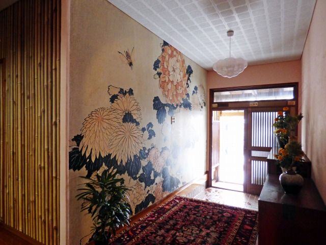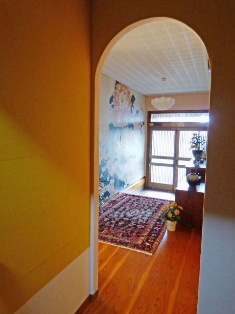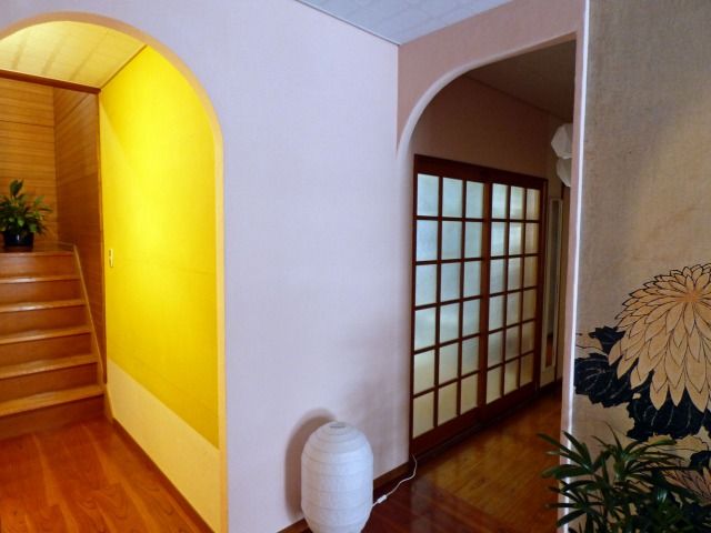 板壁もピンクの漆喰を塗って明るい玄関になりました。