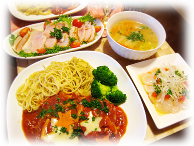 先日に引き続き…晩御飯レポの後半です前半、料理の写真ばっかりで面白くもなんともないにもかかわらずコメありがとうございましたヾ(*´∀`*)ノ+゚。今回も料理の写真ばっかりです(T▽T)ワンパターンにもほどがある(o_ _)ノ彡なので興味ない方はスルッとスルーで構いませーん<(_ _)> では、どうぞ <2月6日>“スモークチキンとキノコの柚子胡椒ペペロンチーノ”柚子胡椒とパスタの組み合わせは大好きでよく作ります オリーブオイルでにんにく(欠かせない♪)とその他の具材を炒めて茹でたパスタを投入!→茹で汁(結構多めでお玉1杯分くらい)に柚子胡椒を溶かしながら加え、塩気が足りない時は塩胡椒で味を整えてハイ!出来上がりねぎ、チーズ、のりなどトッピングはお好みで ★ <2月15日>“煮込みラーメン”スープと麺がセットになったラーメンを頂いたので、野菜やキノコなどと一緒に煮込みラーメンに♪超手抜きw ★ <2月17日>親子丼餃子と野菜の中華スープトマト&ブロッコリー ★ <2月18日>鶏肉のワイン蒸しほうれん草のソテー野菜スープごはん“鶏肉のワイン蒸し”は小さい頃に良く食べたおふくろの味です 無性に食べたくなったので母にレシピを聞き再現しました。 レシピと言っても「えー適当」としか言わないので困惑しながらもなんとか出来ました・:∵(;´∀`A)塩コショウした鶏肉に小麦粉をまぶし多めの油でこんがり焼く。(後から煮込むので中まで火が通ってなくてOK)→鶏肉をいったん取り出し、同じフライパンで玉ねぎとキノコを炒める。→フライパンに焼いた鶏肉を戻し同量のワインと水(200ccくらい?)とコンソメスープの素を加え煮詰める。→汁気が半分くらいになってトロミが付けば完成♪ ★ <2月19日>焼きビーフン白菜とそぼろのスープ山芋短冊“白菜とそぼろのスープ”は過去レシピの“豆腐とそぼろのあったかスープ”の豆腐を白菜に変えただけですw白菜バージョンもなかなか美味しく、とろとろ白菜と相性ピッタリでした(*゚∀゚*)♪ ★ <2月23日>豚肉の味噌焼き鮭の塩焼きワカメと卵の味噌汁ごはん味噌焼きに味噌汁…ボケッとしてたらしくじった(〃ノ_ _)ノ ★ <2月24日>肉じゃが卵うどん中華風サラダごはん ★ <2月25日>豚キムチ 目玉焼き乗っけ春雨スープ卵豆腐ごはん ★ <2月26日>ちゃんぽん餃子大根サラダ 以上でーすなんとか今日の分まで終了(・´д`・;) こうやって並べてみると偏った食生活が浮き彫りになりますね 麺類多いなぁ…魚介類少なッッ(´д`υ)などなど…旦那が魚が苦手(骨がめんどくさいらしい…)なのをいいことに魚料理はほとんど作らないのでレパートリーも乏しい(T▽T)よーし今後の課題は魚料理魚を使ったオススメメニューありましたら是非教えてくださーい(゚∀゚*≡*゚∀゚)(切実)本日も最後までお付き合いありがとうございました(*´ω`*)ノ))