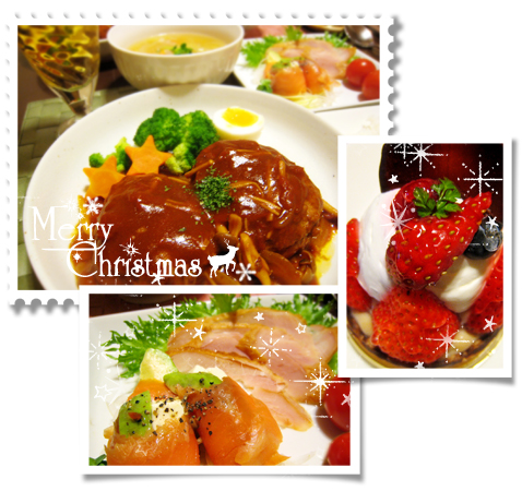 Happy Merry Christmas ☆″ 皆様、楽しいクリスマスを過ごされてますかぁ~ イヴの夜は夫婦二人でまったり迎えましたwいつもと違う事といったら、、シャンパンとケーキがあったことくらいかな(・∀・)あとはいたって普通でしたぁ(´ー`) ★我が家のクリスマスディナー★ホタテのカルパッチョスモークチキン煮込みハンバーグバジルパスタ(ジェノベーゼ風) 野菜スープケーキ ★ 前 菜 ★『ホタテのカルパッチョ』前菜があるとちょっぴりディナーぽく見えるかな♪でも、なんのことはない切ったホタテにオリーブオイル、レモン汁、塩コショウをかけただけと言う簡単さスライスした玉ねぎと相性抜群でしたぁ★ 『スモークチキン』 こちらMy Fatherの手作りでございます。何かと凝り性のうちの父親はいつぞやからスモーク作りに目覚め、庭にmy燻製機を作ってしまいました。毎年この時期になると何かに取り付かれたようにスモークしまくってます||ョД`;;)味は…格別です ★ メ イ ン ★『煮込みハンバーグ』ハンバーグを焼いてトマトベースのソースで煮込みました。クリスマスっぽくするために、にんじんとチーズを星型にして飾ってみたけど、チーズは溶けてよく分からない物体になってしまいました・:∵(;´∀`A)パスタはバジルを使ってジェノベーゼ風の味付けにしました。 ★ デ ザ ー ト ★ 『ケーキ色々』旦那が帰りに買ってきてくれました。この日ばかりはダイエットはお休みです ヾ(o´Д`)ノ ヒャッホーウ♪ ★ お ま け ★何かと凝り性な父親はイルミネーションも大好きw よいクリスマスをヽ(*'∀'*)人(*'∀'*)ノ