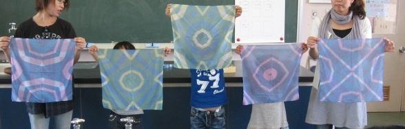 ♪ 選びきて親子で遊ぶ二色染めふれあい講座に歓声あげり ‥‥‥‥‥‥‥‥‥‥‥‥‥‥‥‥‥‥‥‥‥‥‥‥‥‥‥‥‥‥‥‥‥‥‥‥‥ 毎年この時期に、常滑市の岩滑小学校で恒例の「親子ふれあい講座」がある。 板締め絞りの「ハンカチ二色染め」は、大変人気で、来年は定員を増やしたいとのこと。23種類もの講座が設定されている中からこちらを希望する親子が多く、定員オーバーとなっているらしい。 40名ほどの親子が初めて板締め絞りをするのですが、年によってその様子が少しづつ違う。今年の親子は慎重なのか思慮深いのか、何だか少しもたついていた感じ。 初めの色は「ブルー」で染め、二度目の色を、今回は「イエロー」と「ピンク」の二色を用意した。二色が染め終わり板を外すまで、どんな模様になっているのか分からないところが絞り染めのいいところ。 板をはずして広げる時がクライマックス(ちょっとオーバー)だ。 意外な模様が出てきて、驚きの歓声が上がる。それこそみんな違うので他の人のも気になる。本当は全員が染め終わったところで「一斉にオープン」と行きたいところだが、人数が多く待ち時間が長くなるので拙い。 今回も、何時ものように少し早めに終了。最後は恒例の、テーブルごとに前に出てのお披露目だ。 みんな違う模様で、それぞれ個性的。いつもながら面白いものが出来た。 二色目の色が少し薄かったかな。人数が多いのでこの辺りの調整が難しい。「日歌」が千首を超えたのを機に、「游歌」とタイトルを変えて、2009年2月中旬より再スタートすることにしました。★ 「ジグソーパズル」 自作短歌百選