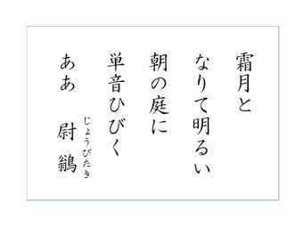 ♪ 旭化成の研究室へ入ったと甥の進路を別れ際に聞く‥‥‥‥‥‥‥‥‥‥‥‥‥‥‥‥‥‥‥‥‥‥‥‥‥‥‥‥‥‥‥‥‥‥‥‥‥ 朝日新聞に「探求」というコーナーが出来て、こんな記事が載っていた。日本文学を翻訳し海外に紹介している外国人は何人かいるが、この人は知らなかった。 短歌と英語に興味ある方には持って来いだね。短歌の読み方を英語の語彙から学ぶというのも何だか新鮮だ。日本の和歌研究家には異論のあるものも有るかもしれないが、解釈の別れる歌も沢山あるわけだし、その辺りは大らかに捉えておけばいいんじゃないかな。ワカワカ Yahooで3586円 商品名の「WHACK」は「ぴしゃりと打つ」を指す英単語で、かるたを取る様子をイメージ。「WAKA」は「和歌」、「百人イングリッシュ」は「百人一首」に掛かっているという。 英語の俳句を詠む文化は根付きつつあるようですが、さすがに短歌を英語で詠むは難しいだろう。翻訳なら何とかなるということだね。シラブル(音節)で五七五七七に合せる作業は、日本語よりも語彙が少ない言語にとってはかなりの困難を伴うだろう。しかし、英語には1音節の単語がたくさんあるので案外いけるのかも知れない。 まあ、曲に歌詞を付けるのは難しいけど、歌詞に曲を付ける方が楽だというのに似ているか? 似てないか・・。