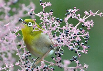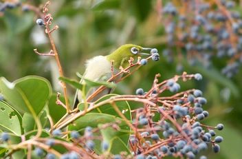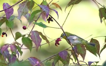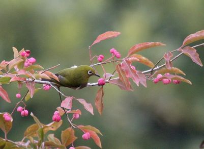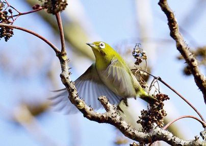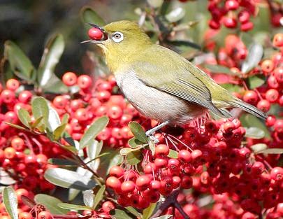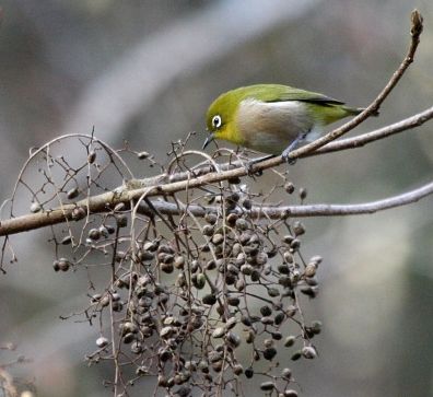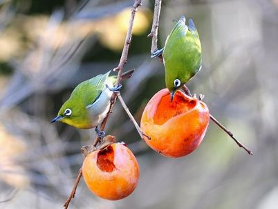 隣家の庭の柿の木にもやって来て、とても賑やかです。顔に似合わず雑食性で、虫も食べるし木の実なら何でも食べる。甘いものが好きで、花の蜜は勿論、果物も大好きだし砂糖水でも喜んで飲む。