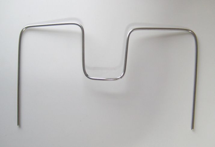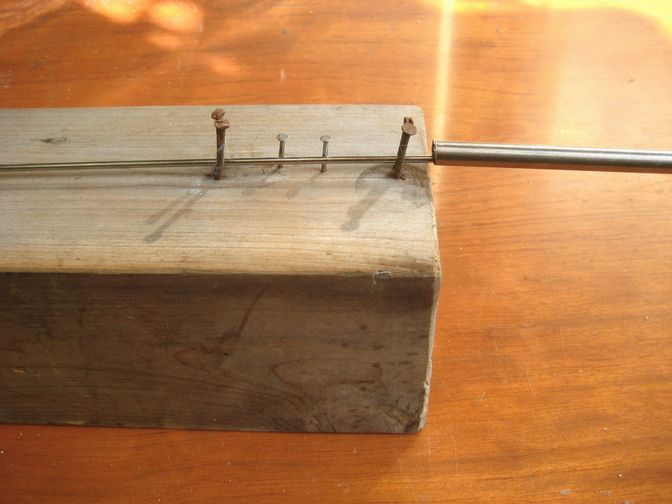 角材に釘を何本か打ち付け、釘で抑えて90度に曲げる。ステンレスはかなり硬いので、直角に曲げるのはコツが要る。木々の位置をもう少しきちんと決めてやった方が良かったかも知れない。丸棒に寸法を記しておき、端から順に曲げていく。それはペンチでは無理なので、9mmのパイプを差し込んで曲げた。