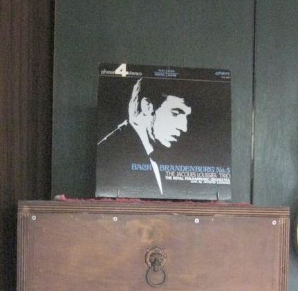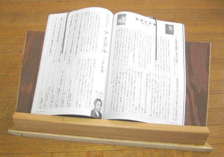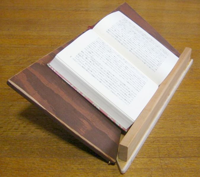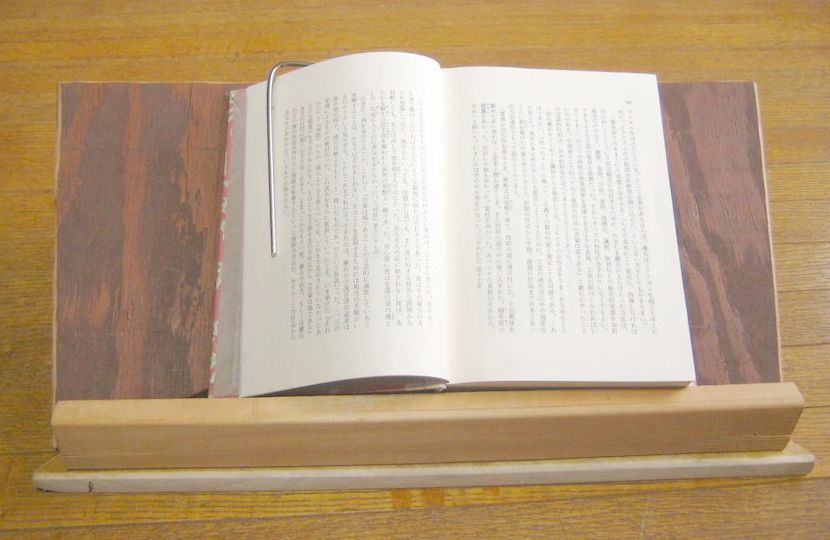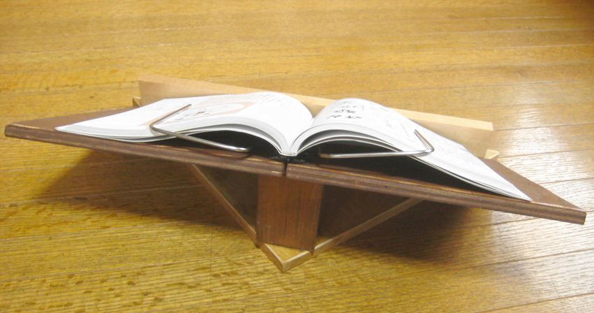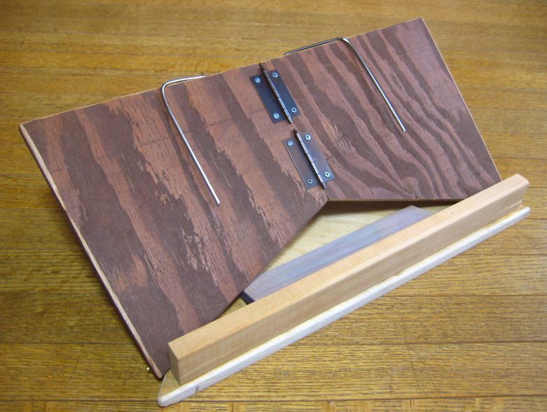 掛けているレコードのジャケットをスピーカーの上に立てるのに使っていたものを代用する。への字形にして斜めに立てかけるもので、そのままでは使えないが、ちょっと手を加えれば何とかなるかなと。