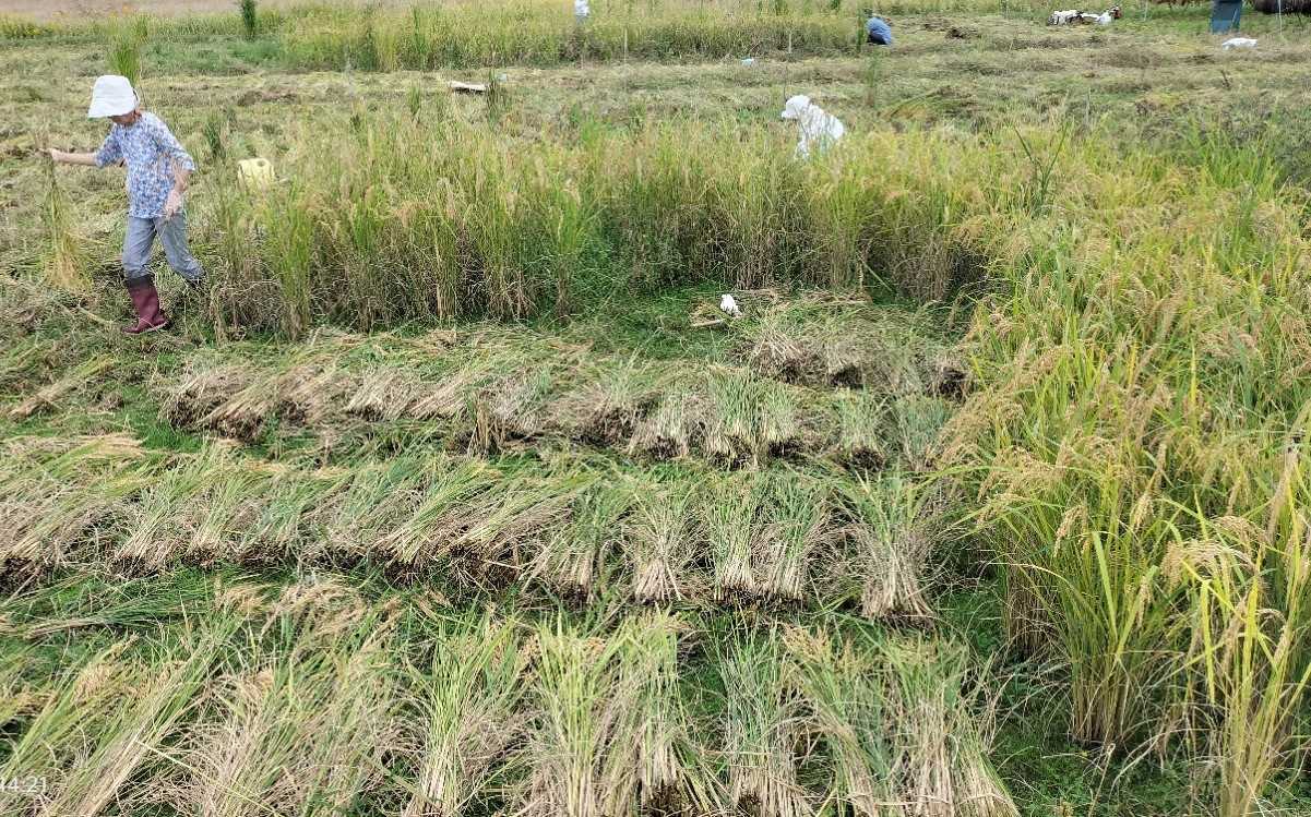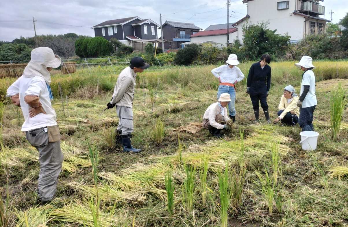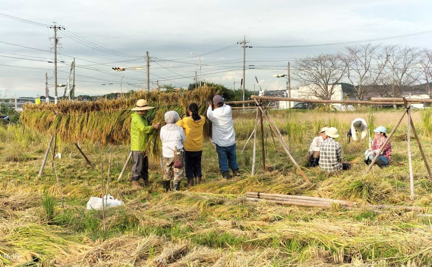 ♪ 大空の下で稲刈りアトピーに悩む人らの希望の稲穂