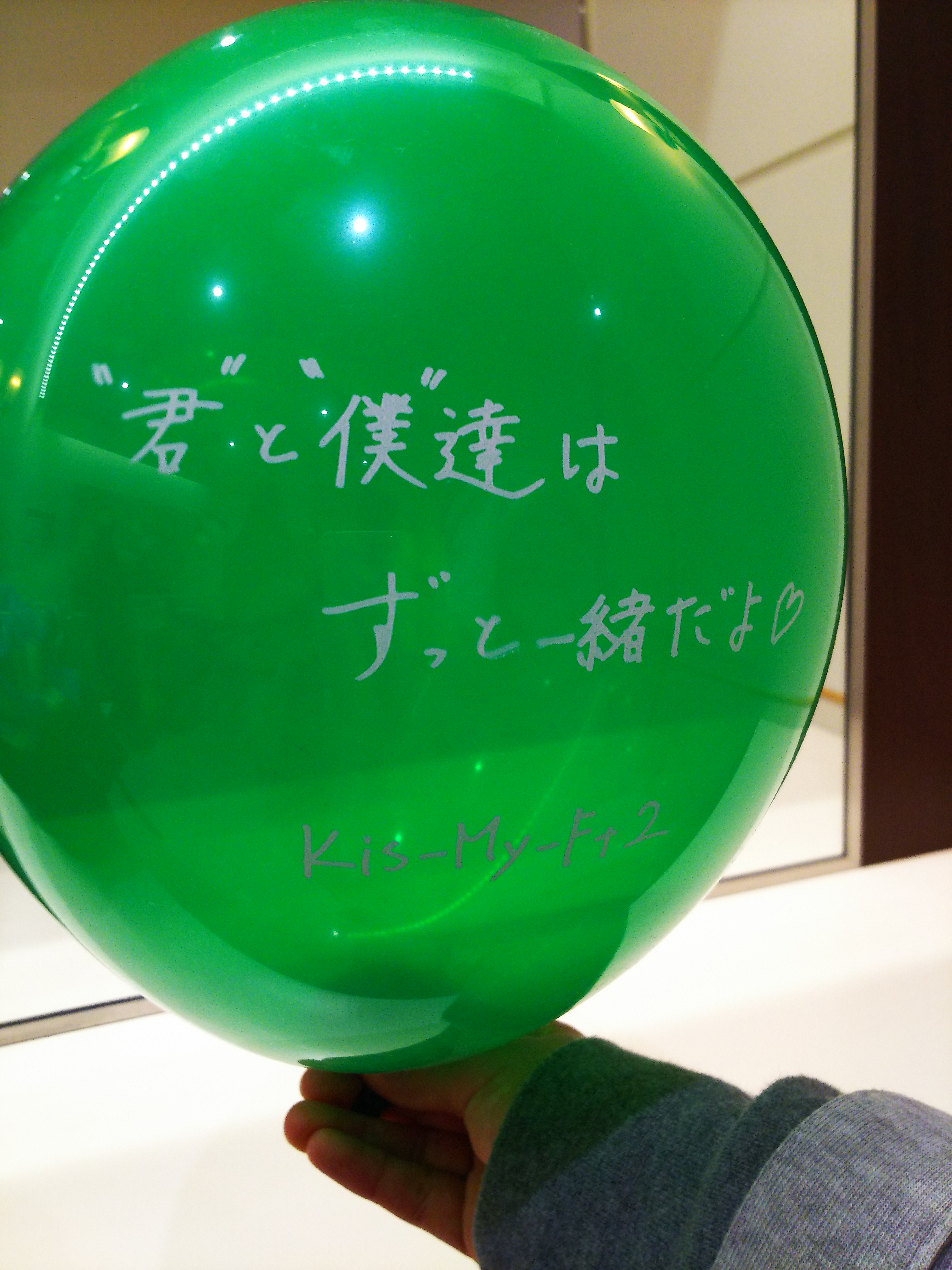 京セラドーム 参戦しました~~今回なんと アリーナ・・あ・・ 埋もれ組だわ・・もう ステージの様子全然見えない・・夏と 同じ所は いいんですが 違ってる所 見たかった・・冬バージョン 天井見れば、 怪しい形が 浮いていてもしかしたら~風船?と 思ってたら はいはい 来ました風船 赤白緑 降って 後ろの方でしたから 自力では取れず・・ 大量に持ってる方から 頂きました銀テープも 自力で取れず 大量に持ってる方から 頂きキスマイファンは やさしい~ これDVDになれたらいいのになぁ~期待してます!!